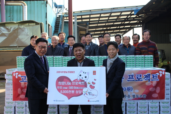 지난 20일, 일산동구 성석동 고양TMR사료공장(고양낙우영농조합법인 대표이사 이선주, 젖소농가 사료생산)에서 희망나눔프로젝트의 일환으로 사랑의 우유 전달식이 열렸다. 이날 전달된 우유는 진공우유 200ml 24개들이 500박스로서 800만원에 상당하며, 고양시 사회복지협의회 푸드뱅크로 전달됐다.