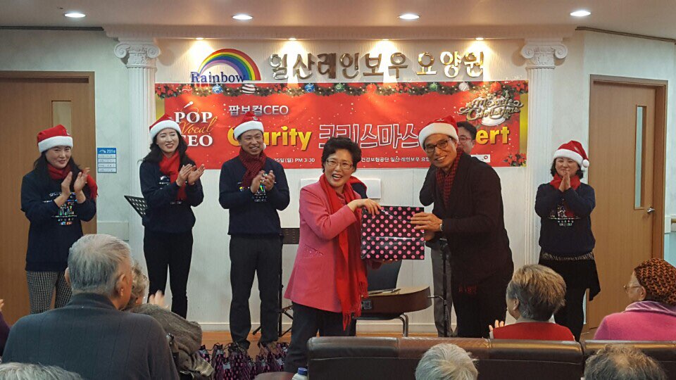 공연이 끝난 후 팝보컬CEO 회원들은 크리스마스 선물로 목도리, 네크워머, 수면양말 등을 어르신들에게 안겨드렸다. 보디빌더 이현아씨는 온열 패치를 어르신 한분 한분에게 붙여 드렸다. 팝보컬CEO 회원들은 이날 후원한 고기 30㎏으로 수육 등을 만들어 어르신들 식사 수발을 하는 지극한 ‘효심’도 보였다.