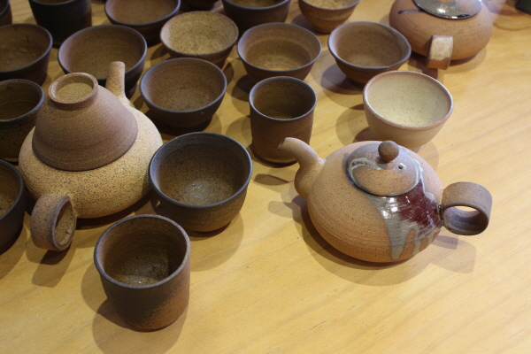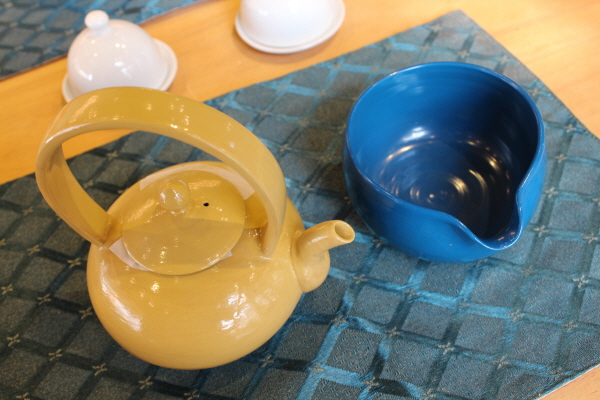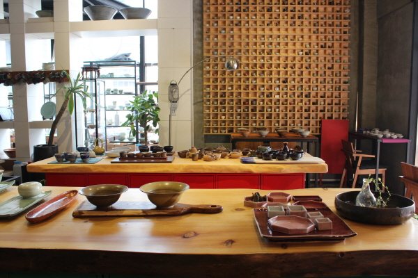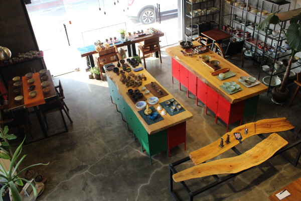 안쪽으로는 가운데가 불룩하게 휘어진 나무의 모양새를 그대로 살린 멋스러운 테이블이 놓여 있다. 햇살이 잘 드는 측면 창을 따라서도 별도의 전시 공간이 이어진다. 안쪽 벽에는 손잡이와 주둥이 모양이 다양한, 멋스러운 주전자들이 가득 놓여있다.