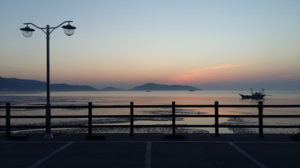 친절하고 부지런한 마트 주인장에게 기회가 된다면 꼭 여기서도 한 번 해맞이를 구경하겠노라는 약속을 인사로 남기고 목적지를 찾아 이동한다. 염두에 둔 곳은 바로 동막해수욕장으로 접어드는 언덕길. 지형으로 보아 어제 저녁의 선두리 갯벌과는 달리 동쪽으로 바다와 갯벌, 산능선을 조망하기에 제격일 듯해서 찜한 곳이다. 드디어 한 횟집 타운의 주차장을 낙점했다. 언덕 중턱에 동쪽 방향으로 탁 트인 전망을 가지고 있었다. 눈앞의 갯벌에는 정박해 둔 고기잡이배도 두어 척 자리를 잡고 있어 사진을 보다 풍요롭게 구성해주는 조연으로 안성맞춤이었다. 물때도 적당했다. 물이 반쯤 차서 갯벌과 수면이 활 모양의 만 안쪽을 사이좋게 나누고 있었다. 해돋이를 기다리는 구경꾼은 오로지 기자밖에 없었다. 스마트폰을 꺼내들고 해 뜨기 전의 여명부터 담는다. 이제 해만 떠오르면 된다.