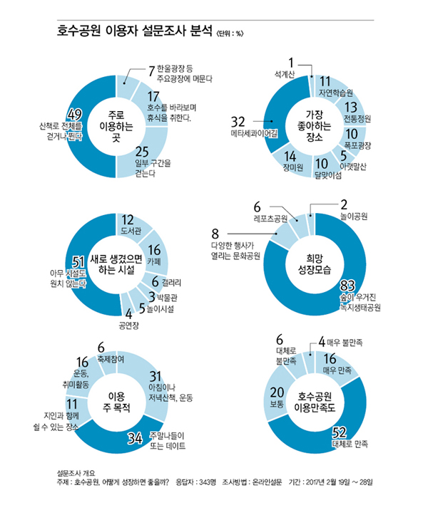 호수공원 이용 만족도에 대해서는 68%가 ‘만족한다’고 응답했고, ‘불만족한다’는 응답은 10%에 그쳤다. 호수공원에서 가장 좋아하는 공간을 묻는 질문에는 메타세콰이어길이 32%로 가장 많았고, 장미원(14%)과 전통정원(13%), 자연학습원(11%) 순이였다. 인공적인 광장인 석계산(한울광장)은 꼴찌(1%)였다.
