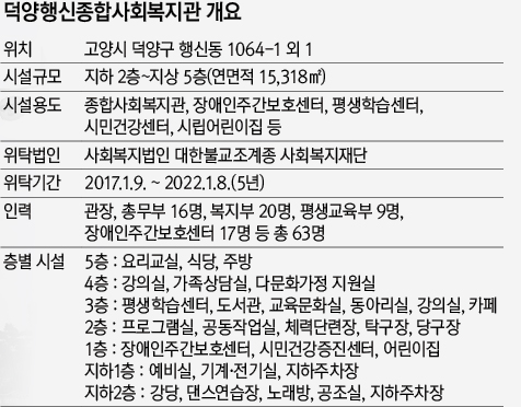 고양시는 행신종합사회복지관을 위탁해 운영하는데, 올해 초 사회복지법인 대한불교조계종 사회복지재단을 수탁기관으로 결정했다. 위탁기간은 2017년 1월부터 2022년 1월까지로 5년간이다. 복지관에서 근무할 직원은 관장을 비롯해 총무부 16명, 복지부 20명, 평생교육부 9명, 장애인주간보호센터 17명 등 총 63명이다.