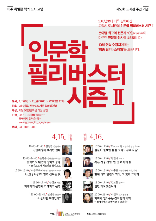 [고양신문] 지난해 국내 최초로 선보여 큰 관심을 모았던 연속 특강 ‘인문학 필리버스터’가 더욱 업그레이드된 버전의 ‘시즌2’를 연다. 고양시도서관센터는 이달 15일과 16일 양일간 오전 10시부터 밤 10시까지 다양한 분야의 명사들을 초청해 특강을 펼치는 ‘인문학 필리버스터 시즌2’를 개최한다. 모름지기 속편은 사이즈와 캐스팅 면에서 전편의 규모를 뛰어넘게 마련. 인문학 필리버스터 시즌2 역시 강사진은 풍성해졌고, 내용은 더욱 다채로워졌다. 10회 연속 수강자들에게는 ‘청중 필리버스터 상’도 수여한다.