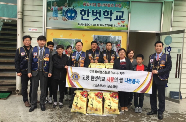 [고양신문] 국제라이온스협회 354-H지구 소속인 고양송포라이온스클럽(회장 이희재)이 덕양구에 자리하고 있는 탈북자 자녀들의 쉼터인 한벗학교에 사랑의 쌀(송포쌀 20kg) 25포를 지난달 31일 전달했다.