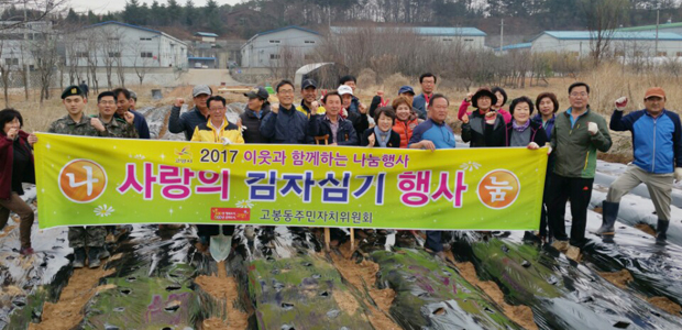 [고양신문] 고봉동은 지난달 31일 고봉동 주민자치위원회(위원장 이재국) 주관으로 고봉동 내 유휴농지를 활용한 텃밭에 ‘사랑의 감자심기’ 행사를 가졌다. 이날 주민자치위원들과 이강호 동장, 직능단체 회원, 동주민센터 직원들, 주민들, 전현직 구청장, 국회의원, 시의원 등은 오전 일찍부터 감자심기에 참여해 밭을 일구고 감자를 심었다. 이번에 심은 감자는 6월말경에 수확해 지역 내 저소득층과 독거노인세대에 전달한다.