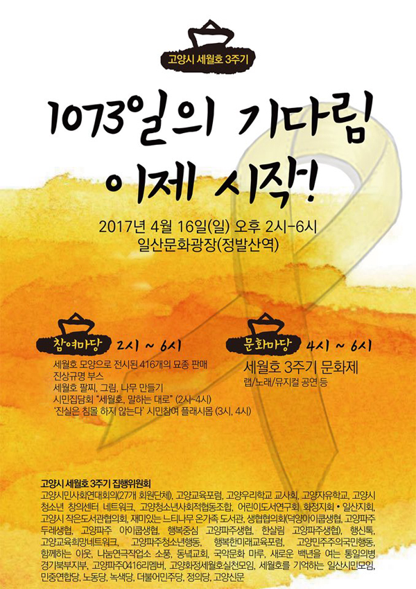 [고양신문] 세월호 참사를 추모하는 고양지역 시민단체가 오는 16일 오후 2시부터 6시까지 세월호 3주기 문화제를 일산문화공원에서 개최한다.