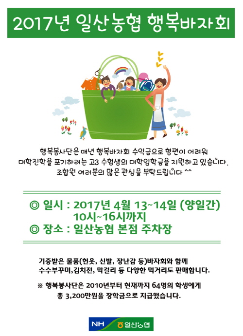 일산농협의 자체봉사단인 행복봉사단(단장 박상애)이 주최하는 ‘행복바자회’는 등록금이 없어 대학진학을 고민하는 고3 수험생을 위한 나눔 행사다.