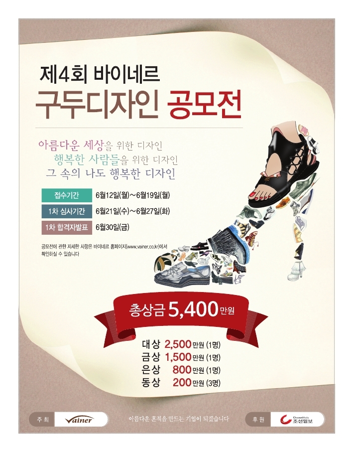 편안한 구두, 이탈리아 명품구두 브랜드'로 알려진 바이네르(대표 김원길)는 2017년 '제4회 바이네르 구두디자인 공모전'을 개최한다. 조선일보가 후원하는 이번 공모전은 참신한 아이디어와 능력있는 디자이너를 발굴하고 구두시장의 활성화를 위해 기획됐다.