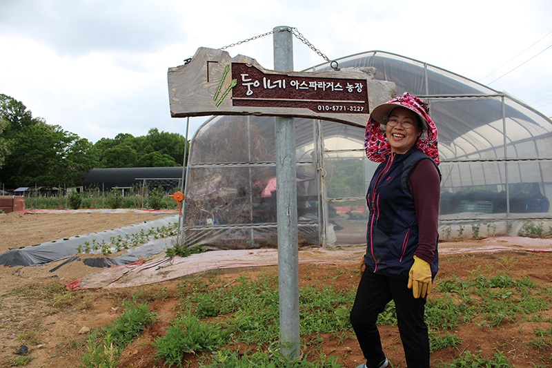 [고양신문] “건강을 선물해준 아스파라거스를 재미나게 재배하고 있어요”라며 환하게 웃는 이연옥 대표. 주교동 선인장 화훼단지 건너편 철길너머 산자락아래 있는 '둥이네농장'에는 이색 채소가 자라고 있다.