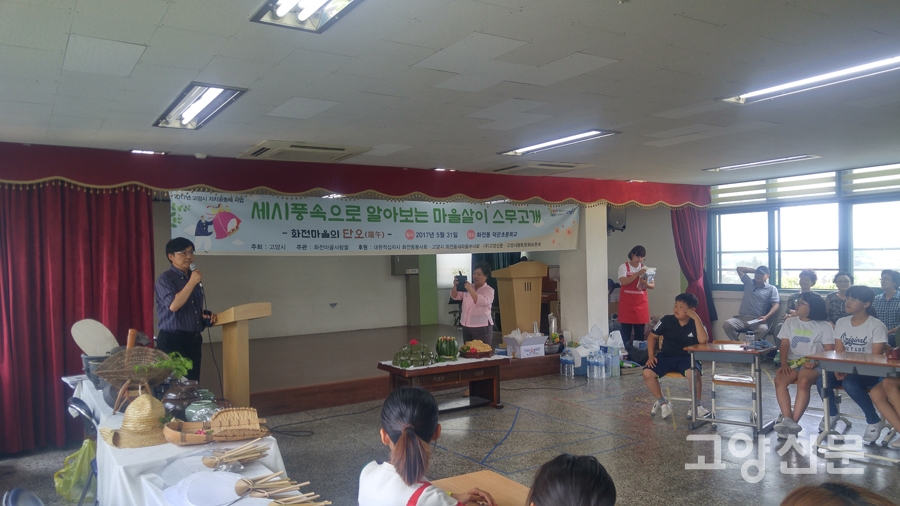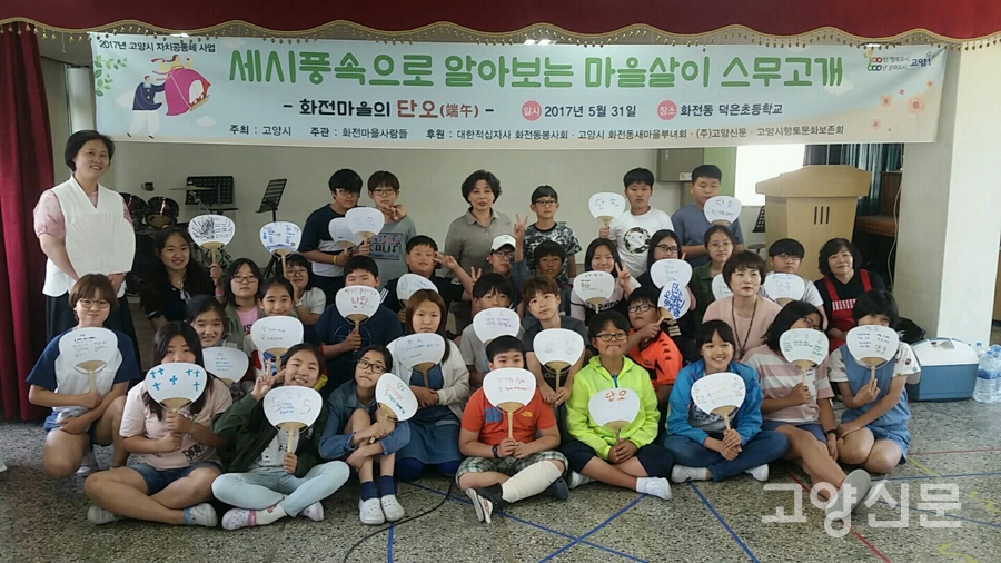[고양신문] 단오가 하루 지난 5월 31일, 화전동에 있는 덕은초등학교(교장 이희숙)에서 학생들과 마을 주민들이 모여 ‘세시풍속으로 알아보는 마을살이 스무고개-화전마을의 단오행사’를 가졌다.