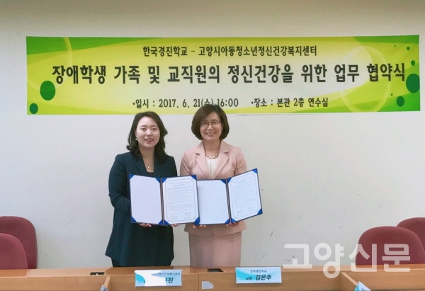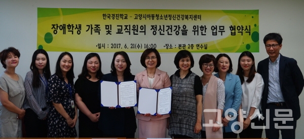 [고양신문] 한국경진학교(교장 김은주, 이하 경진학교)와 고양시아동청소년정신건강증진센터(센터장 박은진, 이하 고아정)가 21일 ‘장애학생 가족 및 교직원 정신건강을 위한 협약식’을 맺고 상호 협력을 약속했다.