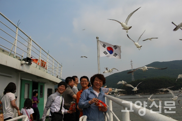 이날 참가자들은 외포리 선착장에서 석모도행 배를 탔다. 이 배는 이달 말 인천 강화도 본섬과 석모도를 잇는 삼산연륙교가 개통되면 사라지는 교통편이다. 회원들은 뱃전으로 몰려드는 갈매기들에게 새우과자를 던져주며 모두들 추억 한자락을 담느라 분주했다. 추억도 잠시, 10여 분 후 배는 석모도 석포리에 도착했다.