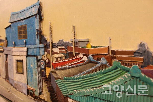 직접 작품을 감상해보면 무슨 말인지 이해가 된다. 가까이서 들여다보면 골판지를 하나하나 잘라 붙여 풍경을 만들어낸 후 페인팅을 입힌 독특한 기법이 감탄스럽다. 정면에서 보면 평면 회화 같지만, 가까이 다가갈수록 입체감이 도드라지는 조형작품이기도 하다.
