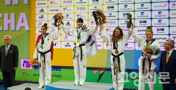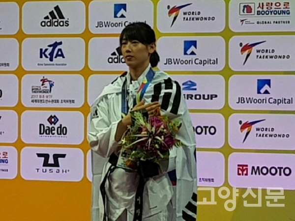[고양신문] 고양시청 태권도팀 소속 이아름(25세) 선수가 한국 여자태권도를 이끌 간판으로 우뚝 솟았다. 이아름 선수는 지난달 30일 전북 무주 태권도원에서 막을 내린 2017 무주세계태권도선수권대회 여자 57㎏급에서 금메달을 획득하며 세계최강 자리에 올랐다. 특히 이번 대회 여자부 MVP에 뽑히는 영광까지 안으며 한국태권도가 4년만에 달성한 남녀부 동반우승 쾌거의 주역이 됐다. 이번 대회는 세계 183개 국에서 2000여 명의 선수가 참가했다.