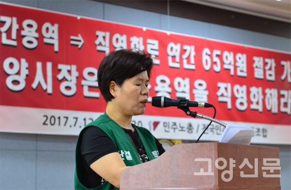 민주연합노조 고양지부 김주실 지부장은 “정부에서 공공부문 비정규직 정규직화 로드맵 발표를 준비하는 등 전사회적으로 비정규직 정규직화 논의가 확산되고 있다. 고양시 또한 청소용역 직영화를 통해 비정규직 문제 해결을 위한 솔선수범을 보일 필요가 있다”고주장했다.