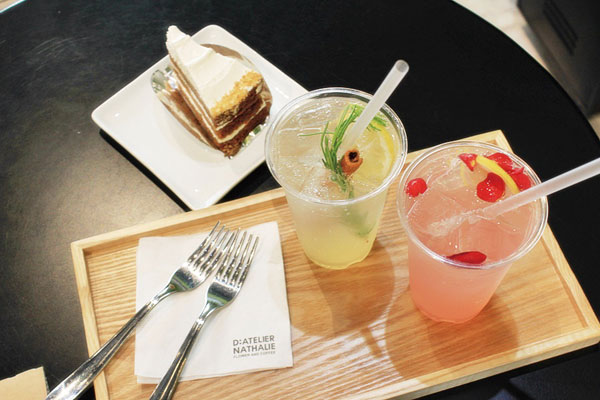 뉴욕치즈케이크, 피칸 타르트, 당근케이크, 초코 카라멜 타르트, 애플 타르트와 마카 도넛을 만날 수 있다. 기온이 높아진 요즘 카페 디 아틀리에 나탈리가 추천하는 메뉴는 애플시나몬 레몬에이드와 트로피칼 레몬에이드다.
