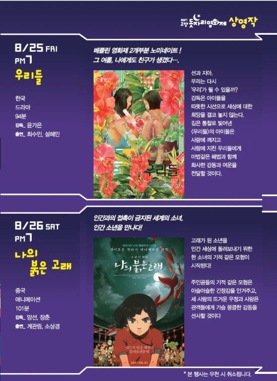 26일에는 애니메이션 ‘나의 붉은 고래’가 상영된다. 인간과의 접촉이 금지된 세계에서 자신 때문에 고래로 변해버린 소년 '곤'을 인간세계로 돌려 보내기 위해 펼치는 소녀 '춘'의 기적 같은 모험을 담았다. 한·중·일 합작으로 화제를 모은 작품으로 경이로운 비주얼과 가슴 뭉클한 스토리, 빼어난 OST가 어우러진 수작이다. 26일 상영 전에는 고양거리아티스트 신한류예술단이 수준 높은 공연도 선보일 예정이다.
