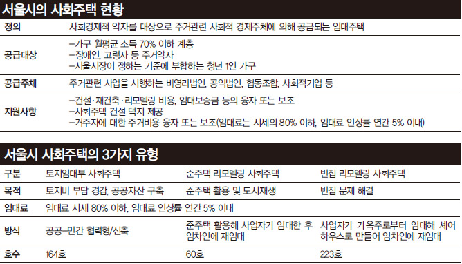 서울시의 사회주택 유형은 3가지다. ▲다세대·다가구·단독주택(방 3개 이상)을 리모델링하는 ‘빈집 리모델링 사회주택’ ▲고시원·숙박시설·업무시설 등 노후된 비주거용 건축물을 리모델링하는 ‘준주택 리모델링 사회주택’ ▲100평 기준 감정평가액 16억원 이하 토지를 서울주택도시공사가 매입하고, 민간이 신축·리모델링해 운영하는 ‘토지임대부 사회주택’이다.