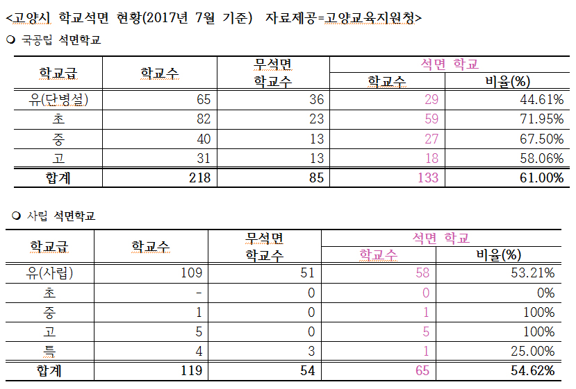 또 다른 학부모는 “우리 자녀가 다니는 학교, 또는 다녀야 할 학교가 석면텍스가 무석면텍스로 이미 교체된 학교인지, 아니면 아직까지 석면위험에 노출된 학교인지를 교육지청 홈페이지에 공개하지 않는 것도 문제”라고 지적했다. 고양교육지원청에 따르면 현재(7월 기준) 고양시 국공립 학교(유치원, 초·중·고) 중 석면학교 수는 133개, 무석면 학교 수는 85개로 석면학교 비율이 61%로 다소 높게 나타났다. 사립학교까지 포함하면 198개 학교가 석면자재에 아직까지 노출돼 있다.