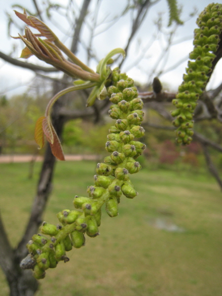 가래나무는 단정학이 있는 자연학습관 입구에서 출발해 정자 쉼터 바로 못 미쳐 산책로 방향에 한 그루 자라고 있습니다. 호두나무와 달리 열매가 여러 개 모여 달리고, 열매는 둥그렇지 않은 길쭉한 럭비공 모양입니다. 잎은 깃꼴겹잎이지만 호두나무에 비해 작은잎이 훨씬 더 많습니다. 작은잎 모양이 농기구 ‘가래’를 닮았다고 해서 이름이 왔을 것으로 추정합니다. 지금 호수공원 가래나무는 벌레들이 잎을 모두 갉아먹어 끙끙 앓고 있습니다. 까닭에 여름에 보았던 수많은 열매들을 모두 잃고 말았습니다.