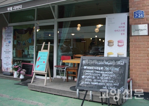 리버티는 분위기가 밝고 인테리어도 다채롭다. 책꽂이에는 주로 자기계발서들이 꽂혀있고 테이블마다 책이 한두 권씩 놓여있어 함께 놓여 있는 작은 화초와 더불어 인테리어 효과를 톡톡히 낸다. 곳곳에 아기자기한 소품들이 놓여 있고 카페에서 진행하는 다양한 교육과 행사 안내 문구들이 붙어 있다. 안쪽에는 10명 정도의 단체 모임이 가능한 공간도 있다. 구석구석 공간의 쓰임새가 알뜰하다.