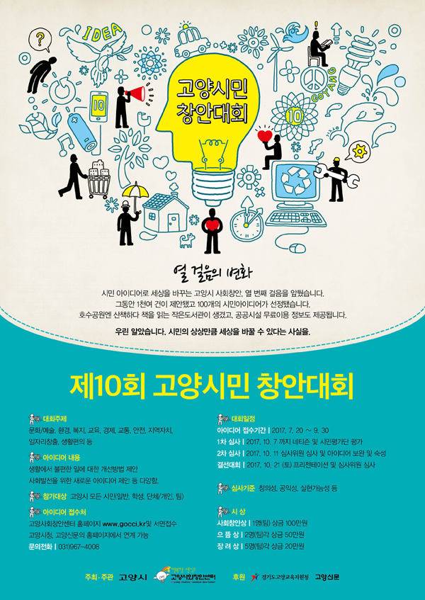올해로 10회를 맞는 고양시민창안대회는 그동안 1000여건이 제안됐고 그중 100개의 시민아이디어가 선정됐다. 호수공원 작은도서관, 공공시설 무료개방은 이미 실현됐고 버스정류장을 밝게 해달라는 아이디어는 20개 정거장을 선정해 태양광 전기시설을 설치할 예정이다. 호수공원 셀프보건소와 무료 공구빌려주기는 예산이 확보된 상태다. 제10회 창안대회는 9월30일까지 아이디어를 접수받고 있다. 자세한 내용은 고양사회창안센터 홈페이지(www.gocci.kr)를 참고하면 된다.