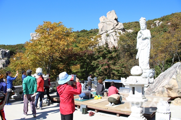 다음날에는 남해 금산 보리암을 찾았다. 주차장에서 셔틀버스를 타고 또 산길을 걸어서 보리암까지 10리 길을 힘겹게 오르자 기암괴석이 있는 절벽 가까이에 자리한 보리암을 만날 수 있었다.