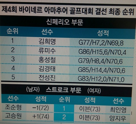 올해로 4회째를 맞은 이번 대회에서 스트로크 부문에 각각 조순형(남)씨가 언더파로, 최인영(여)씨가 이븐파로 최종 우승컵을 거머쥐었다. 신페리오 부문에는 김희명씨가 우승의 영광을 안았다.