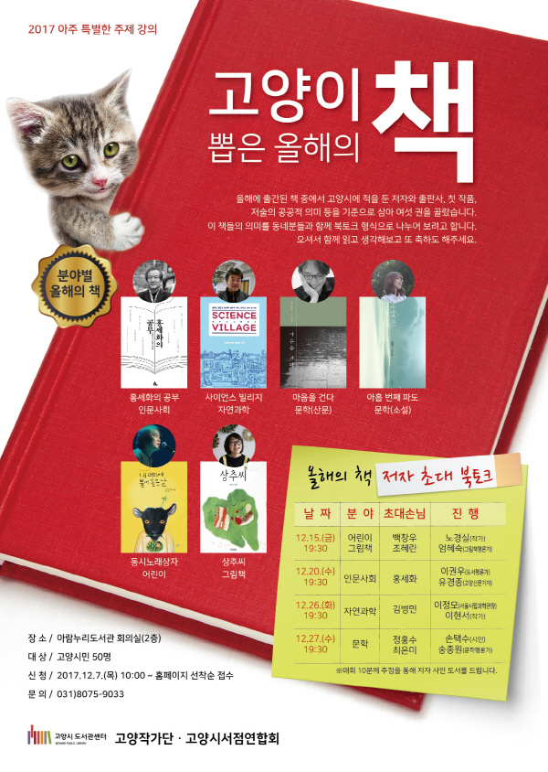 [고양신문] 한 해의 출판문화계를 결산하며 여러 기관과 매체에서 고른 ‘올해의 책’ 목록이 하나둘 윤곽을 드러내고 있는 가운데, 고양시 거주 작가들의 작품을 중심으로 선정한 ‘2017 고양이 뽑은 올해의 책’이 발표돼 눈길을 모은다. 고양시는 올해 출간된 책 중 고양시에 적을 둔 저자와 출판사, 첫 작품, 저술의 공공적 의미 등을 기준으로 인문사회, 자연과학, 문학, 어린이·그림책 등 4개 분야 6권의 책을 ‘올해의 책’으로 선정했다.