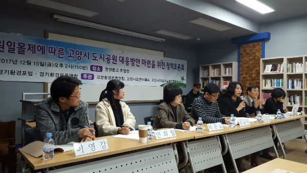 [고양신문] 도시공원일몰제에 따른 고양시 도시공원 대응방안 마련을 위한 정책토론회가 15일 경기환경포럼과 경기환경운동연합 주최로 한양문고 주엽점에서 열렸다. 이번 토론회는 도시공원일몰제로 인한 도시공원의 위기에 대한 진단과 현황을 파악하고 고양시의 공동 대응방안을 마련하기 위한 토론회였다.