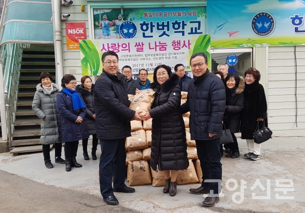 [고양신문] 법무부 법사랑위원 고양지역 청소년위원협의회(위원장 이봉구)는 15일 흥도로 454번길에 있는 북한이주 청소년 배움터 ‘한벗학교’(교장 김윤희)를 찾아 쌀(10Kg) 30포대를 후원했다. 이 자리에 김국일 고양지청장이 참석해 격려의 인사를 하기도 했다.