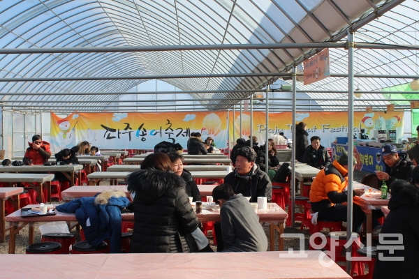 축제의 즐거움에 먹는 재미가 빠질 리 없다. 파주송어축제장에도 커다란 비닐하우스 안에 500여 명이 들어갈 수 있는 넓은 먹거리센터를 만들어놓았다. 이곳에선 얼음구멍에서 잡은 송어를 즉석에서 회를 떠 주거나 구워준다. 솜씨 좋은 기술자들이 선홍색 송어 살을 두툼하게 썰어 낸 회는 보기에도 먹음직스럽다. 한 마리도 못 잡았다면 별 수 없이 수족관에 있는 녀석을 돈을 주고 살 수밖에. 그밖에 어묵과 떡볶이, 커피와 코코아 등 따끈한 간식거리가 찬바람에 움츠러든 몸을 풀어준다.