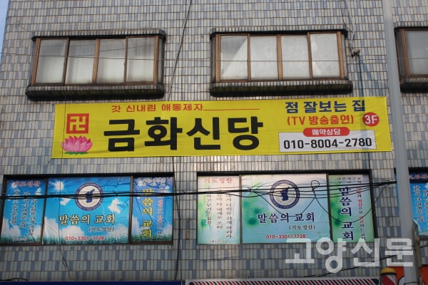 종교와 연관된 간판이 교회만 있다고 생각한다면 법당과 신당이 섭섭하다. 무속과 점집, 운명철학 등을 두루 아우르며 불교의 형식도 차용한 공간이 마을 곳곳에서 발견된다. 법열화, 천부, 해담사, 태사철학관, 일월산, 혜산작명원백기당 등이 이에 해당한다. 대개 임대료가 저렴한 상가 건물 2~3층에 한 칸을 얻은 사정은 교회나 신당이나 비슷비슷해 보인다. 한 건물에는 2층에는 교회가, 3층에는 신당이 경쟁하듯, 또는 사이좋게 공존하듯 자리 잡고 있기도 했다. 아무쪼록 평화의 기운이 그 건물에 강림하기를….