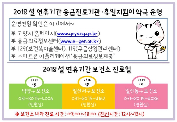 설 연휴기간 동안 진료병원과 휴일지킴이 약국을 안내받으려면 관할 보건소나 고양시민원콜센터(031-909-9000), 구급상황관리센터(국번없이 119), 보건복지콜센터(129)로 연락하면 된다.