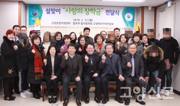 [고양신문] 설 명절을 앞둔 12일 법무부 고양준법지원센터(소장 손세헌)는 법무부 법사랑위원 고양파주지역연합회의 지원으로 보호관찰 대상 청소년 15명에게 사랑의 장학금(300만원)을 전달했다.