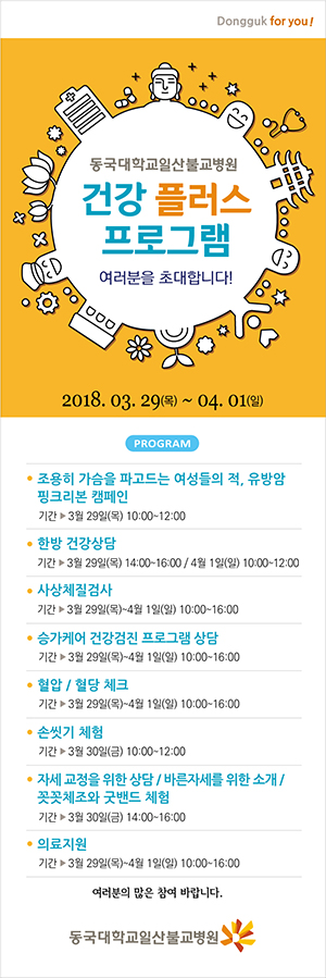 불교계 유일 종립병원으로서 참가하게 되는 동국대학교일산병원·일산한방병원은 행사에 참석한 스님 및 불자를 대상의 다양한 ‘건강 플러스 프로그램’이 준비될 예정이다.