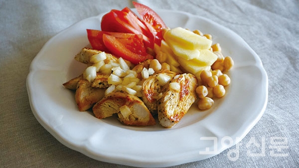 양파쯔유드레싱으로 맛을 낸 닭가슴살샐러드