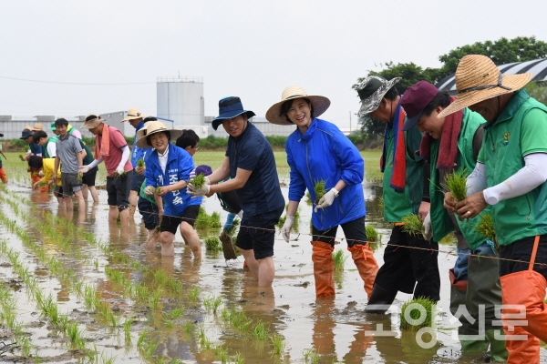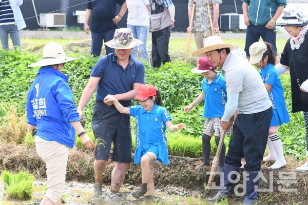 손모내기 시간에는 사랑어린이집, 명지어린이집 소속 40여 명의 어린이들도 체험학습 차원에서 함께 참여해 눈길을 끌었다. 김재하(7세) 어린이는 “오늘 모내기한 쌀이 북한친구들에게 잘 전달되는 날이 왔으면 좋겠다”는 바람을 전하기도 했다.
