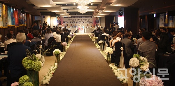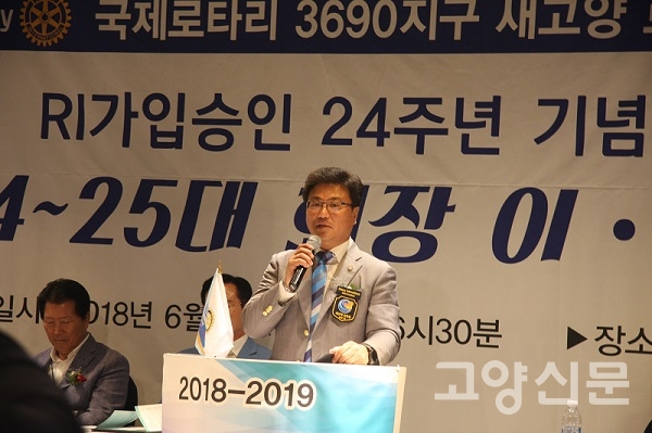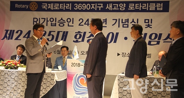 [고양신문] 새고양 로타리클럽 24대·25대 회장 이·취임식이 지난 21일 고양종합운동장 내 플랑벨 웨딩홀에서 성대하게 열렸다. 이날 행사는 새고양 로타리클럽의 RI(Rotary International) 가입 24주년을 기념하는 자리를 겸했다. 이 자리에는 고양과 파주 각 지역 로타리클럽의 회원들, 필리핀 자매클럽인 일로일로 시티 로타리클럽 회장과 회원 등 많은 축하객이 참석했다.