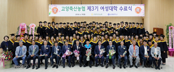 고양축산농협(조합장·총장 유완식)이 3기 여성대학 수료식이 지난 6월 19일 덕양구 원당동 소재 농협대학교 도농협동연수원 대강당에서 있었다. 3개월 동안의 다양한 프로그램으로 여성으로서의 경쟁력을 높이는 교육을 통해 자랑스러운 수료식을 가졌다. 이날 수료식에는 유완식 총장을 비롯해, 김위상 농협대학교 총장, 홍순철 인천축협 조합장, 고양축협 임직원들과 수료생들이 참석해 자리를 빛냈다.