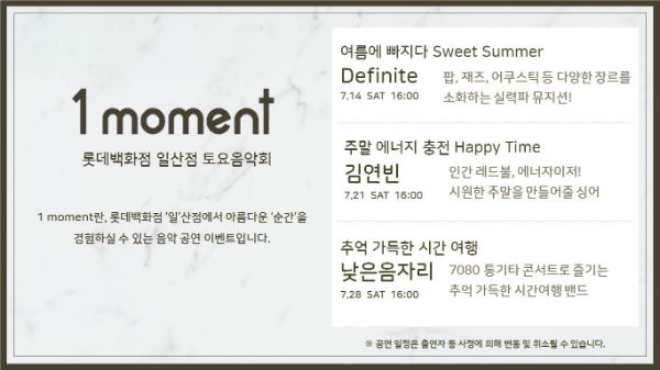 롯데백화점 ‘일’산점에서 아름다운 ‘순간’을 경험할 수 있는 1 moment 토요음악회도 열린다. 고양시를 기반으로 활동하고 있는 음악인이나 신인 가수에게 무대를 제공해 아티스트들의 활동을 돕고 백화점 방문 고객들이 쇼핑과 더불어 문화체험을 즐길 수 있도록 하는 기업의 사회적 책임(CSR)의 일환으로 매주 토요일에 진행된다.