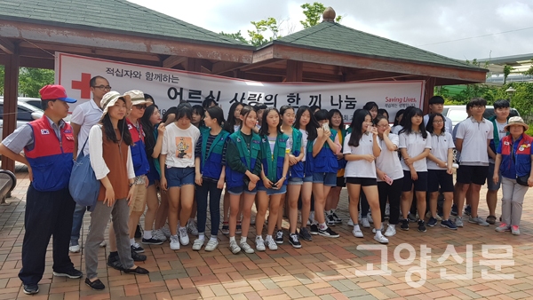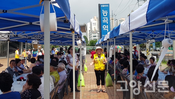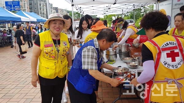 [고양신문] 대한적십자사 봉사회 고양지구협의회(회장 김정희)가 지난 14일 능곡역 광장에서 사랑의 삼계탕 나눔 급식 행사를 진행했다.