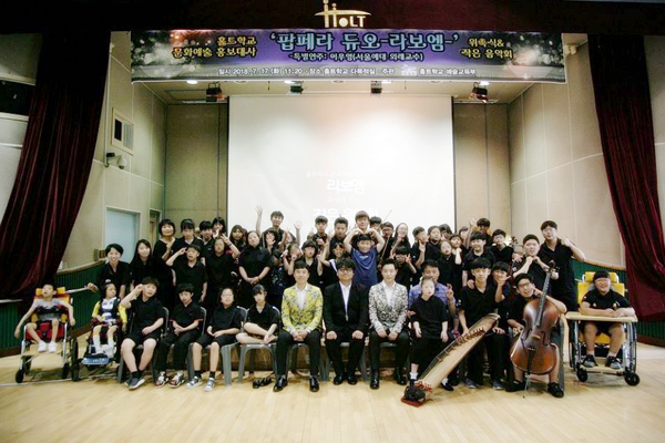 [고양신문] 2018 장애학생 문화예술 거점교육기관(경기도교육청 선정) 홀트학교(교장 김봉환)가 지난 17일 팝페라듀오 라보엠(한웅희·고진엽)을 문화예술 홍보대사로 위촉했다. 또한 라보엠과 함께 ‘소망에 관하여’를 작곡한 이우영(서울예술대학 외래교수)도 홀트학교 명예교사(작곡)로 위촉했다. 이날 위촉식에는 라보엠과 학생들이 함께 준비한 음악회도 있었다.