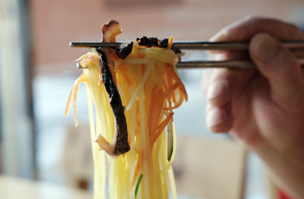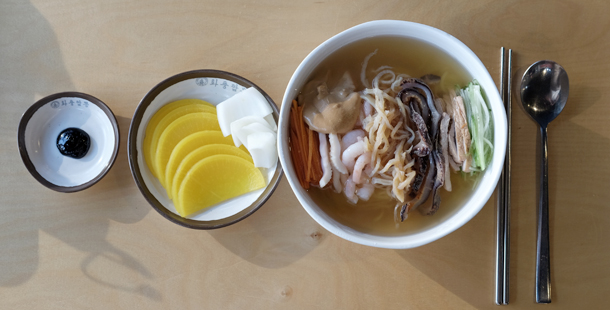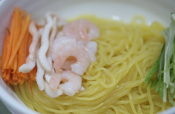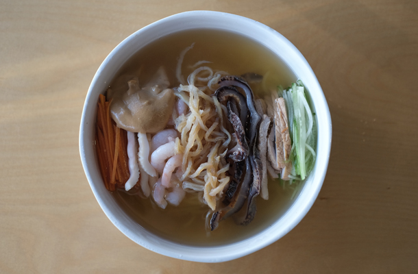 중국식냉면은 보기만 해도 입안 한가득 군침이 돈다. 시원한 육수와 면 위에 얹힌 당근 땅콩버터 오징어 새우 해파리 해삼 돼지고기 오이의 가지런함은 만지기 아까울 정도로 오묘한 색깔을 보여준다.
