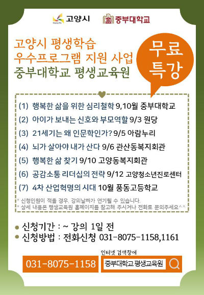 이번 인문학 특강은 학생이나 일반시민 등 누구나 무료로 참여할 수 있고, 여러 개의 강좌에 중복해서 신청해도 된다. 강의에 대한 자세한 문의나 수강신청은 중부대학교 평생교육원 홈페이지(https://lifelong.joongbu.ac.kr)나 전화(031-8075-1158)로 하면 된다.