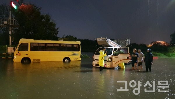 주택침수 피해는 주교동, 대화동, 송포동, 장항1동의 저지대에서 집중 발생했는데, 주로 빌라나 노후 건물의 반 지하 주택의 피해가 컸다. 정상적 배수 시스템으로 감당할 수 없는 시간당 70mm의 집중호우가 쏟아지며 부분적으로 도로가 침수되고, 교통이 통제되기도 했다. 내곡지하차도를 비롯해 도로 곳곳이 물에 잠겨 통행에 지장을 초래했고, 가로등이 꺼져 차량들이 뒤엉키는 상황도 곳곳에서 벌어졌다. 고양시청 앞 오거리도 주변도로에서 흘러내려온 빗물이 차올라 시간대별로 통제와 통행재개를 반복했다.
