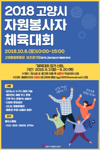 [고양신문] 고양시 자원봉사자들이 여는 친목과 화합의 큰잔치인 2018 고양시 자원봉사자 체육대회가 10월 6일 토요일 고양종합운동장 보조경기장에서 열린다. 이번 행사는 고양시자원봉사센터 등록 단체와 수요처 회원들, 일반 자원봉사자 등 1500여 명이 참여할 것으로 예상된다.