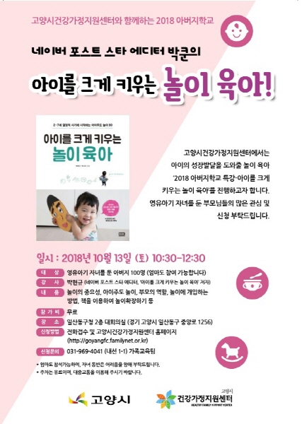 [고양신문] 고양시 건강가정지원센터는 ‘2018 아버지학교’의 일환으로 오는 10월 13일 오전 10시30분 영유아기 자녀를 둔 아버지를 대상으로 ‘아이를 크게 키우는 놀이 육아!’ 특강을 진행한다.