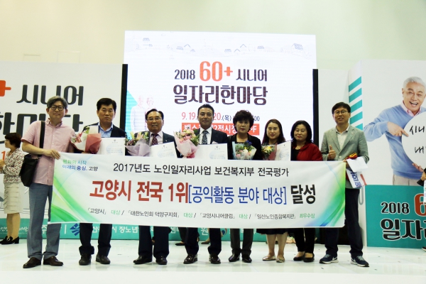 고양시니어클럽이 지난 19일 부산 벡스코에서 열린 ‘2017년 노인일자리 및 사회활동지원사업 평가대회’에서 공익형 부분 대상인 보건복지부 장관상을 수상했다. 이번 평가대회는 2017년 한 해 동안 추진한 노인일자리와 사회활동지원사업의 운영 성과를 평가해 우수 지방자치단체와 수행기관을 선정 포상했다. 고양시니어클럽은 2015년 인력파견형 대상에 이어 두 번째 대상을 수상하는 성과를 냈다.
