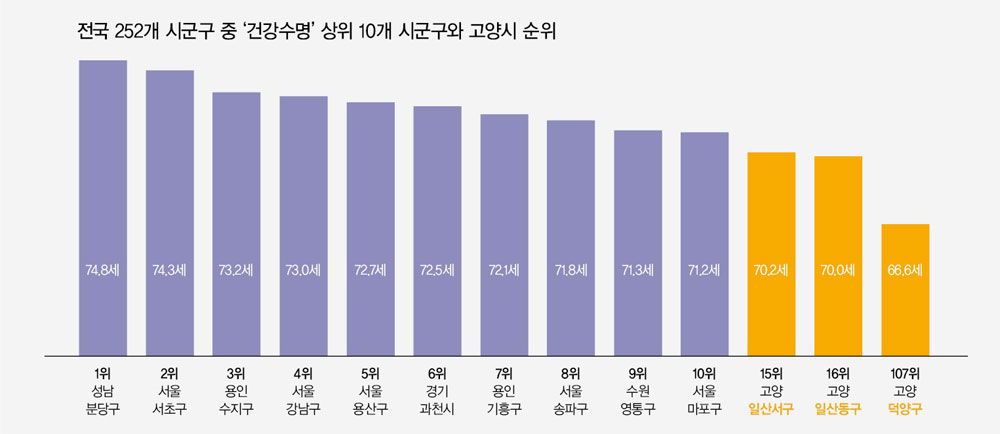 한국건강형평성학회의 17개 광역시도 및 252개 시군구별 건강불평등 현황에 따르면 고양시의 건강수명은 전국 평균 이상이었지만 지역 내 격차가 큰 것은 문제점으로 나타났다.